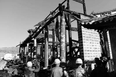 1月3日,消防员在查看被火灾烧毁的云南巍山古城拱辰楼。