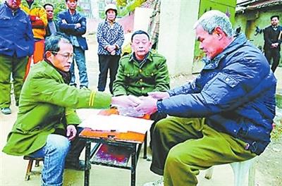 何运香的丈夫邓双生(左)给工友发放工钱。