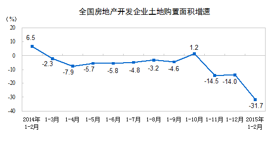 1-2月份,房地产开发企业土地购置面积2773万平方米,同比下降31.7%;土地成交价款699亿元,下降30.2%。
