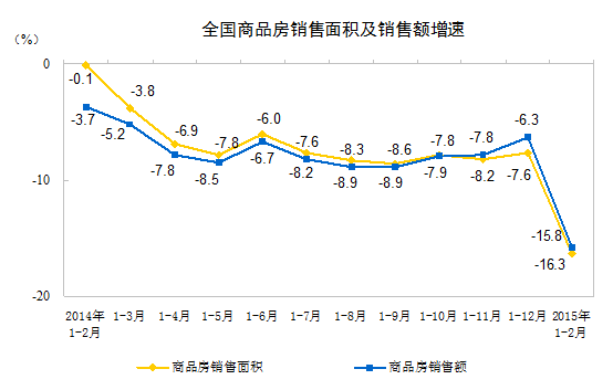 中新网3月11日电 今日,国家统计局发布《2015年1-2月份全国房地产开发和销售情况》。报告显示,2015年1-2月份全国房地产开发投资8786亿元,住宅投资5922亿元,增幅较去年全年有所回落。商品房销售面积8764万平方米,同比下降16.3%。另外,2月末,商品房待售面积63922万平方米,比去年末增加1753万平方米。
