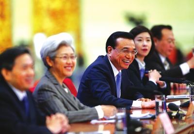 据新华社电十二届全国人大三次会议15日上午在人民大会堂举行记者会,国务院总理李克强应大会发言人傅莹的邀请会见中外记者,并回答记者提问。记者会在人民大会堂三楼金色大厅举行,历时约2小时,李克强来者不拒,共回答了17个问题,参加采访的中外记者近900名。