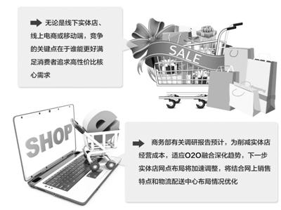 综合多种因素分析,在国家鼓励发展“线上线下互动的新兴消费”的大背景下,更多零售企业将加快转型升级,转向全渠道发展,实体店面的大调整还将继续。商务部流通业发展司的有关调研报告预计,为削减实体店经营成本,适应O2O融合深化的趋势,下一步实体店的网点布局将加速调整,关掉部分经营惨淡的门店,调整部分门店改作服务于网上业务的仓库中心,部分网点布局也将结合网上销售特点和物流配送中心布局情况进行优化,更加贴近生活小区,更好地与网络购物相结合,完善网订店取等方面功能,以赢得客流和商流量。