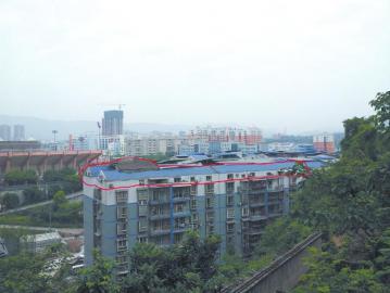 从高处看迎宾园小区(红色部分即坡屋顶下楼顶平台上搭建的住房)。