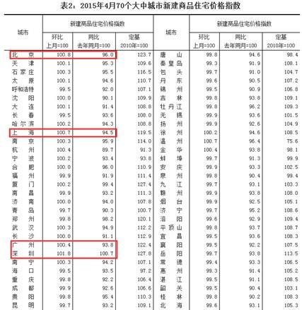 与上月相比,70个大中城市中,价格下降的城市有48个,上涨的城市有18个,持平的城市有4个。环比价格变动中,最高涨幅为1.8%,最低为下降0.7%。