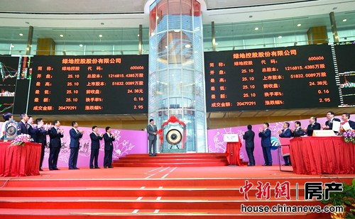 中新网8月18日电 今天,绿地集团在上海证券交易所交易大厅举行股票上市仪式,当日A股开市,绿地控股(600606.SH)在交易大厅的巨幅显示屏上以25.10元/股的开盘价亮相,标志着绿地集团整体上市圆满收官,正式登陆A股。
