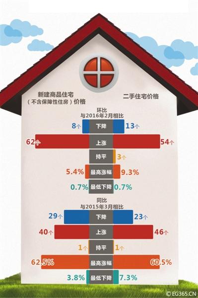 上月国内绝大多数城市房价环比上涨,上涨城市个数比2月份大幅增加,总体涨幅扩大。发布的数据显示,3月份70个大中城市新建商品住宅和二手住宅价格环比上涨的城市分别有62个和54个,分别比2月份增加15个和20个;持平的城市个数分别为0个和3个,分别比2月份减少8个和5个;下降的城市个数分别为8个和13个,分别比2月份减少7个和15个。新建商品住宅价格环比上涨的62个城市里,涨幅高于2月份的城市有55个,比2月份增加22个;二手住宅价格环比上涨的54个城市里,涨幅高于2月份的城市有47个,比2月份增加23个。上月全国70个大中城市新建商品住宅和二手住宅价格环比综合平均涨幅分别比2月份扩大0.6和1.2个百分点。