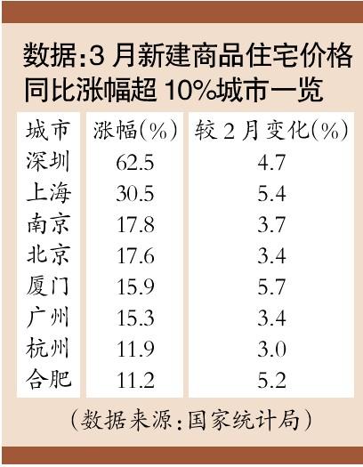 同比来看,3月70城中,新建商品住宅价格上涨的城市有40个,较2月增加8个。本报记者统计发现,其中涨幅超过10%的城市,也由2月的6个扩大到8个,且同比涨幅都有不同程度的扩大。同比涨幅最大的依然为深圳和上海,涨幅分别超过6成和3成。