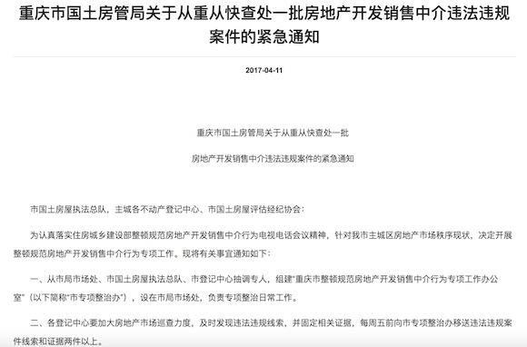 参与互动 华龙网4月11日20时34分讯(首席记者 佘振芳)今(11)日,重庆市国土房管局官网发布了《关于从重从快查处一批房地产开发销售中介违法违规案件的紧急通知》,决定开展整顿规范房地产开发销售中介行为专项工作,通知称,对存在违法违规行为房地产开发和中介企业及相关从业人员,要依法采取责令限期整改,处以罚款、取消网上签约资格、停业整顿等措施,并纳入“黑名单”。