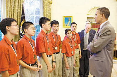 获得MathCounts的全国冠军以后,到白宫椭圆形办公室见总统已是十年来的传统。总统和大家轻松谈话,恭喜并且鼓励他们,还打趣要今年的个人冠军Mark Sellke当他女儿的数学家教。