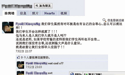 这起事件也被该校学生带上面子书纷纷议论,其中一名学生,更直接在面子书留言内容大约如下:“现在老师真的越来越糟糕,说话不经大脑。XXX是笨蛋老师,她竟然说我们华人是卖下体的,说我们破坏马来西亚,还说最好华人不要再增加了。每次说要一个马来西亚,现在这样说话,算什么一个马来西亚?......”