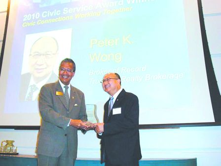中新网7月7日电 据加拿大《明报》报道,加拿大多伦多地产局(Toronto Real Estate Board)日前颁发2010年度社区服务奖(Civic Service Award),Trustwell Realty恒昌地产代理商Broker of Record华人黄家麒(Peter Wong)获得殊荣。