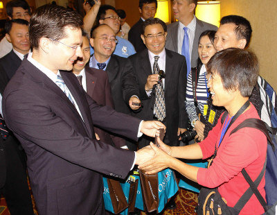 在与杜江等人会晤后,柏利文也代表哈珀总理,向首发团广东中旅团员致赠纪念品,并一一握手问好、寒暄与交谈。