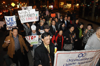 中新网12月16日电 据美国《世界日报》报道,为19岁华裔军人陈宇晖争取死亡真相的烛光游行15日举行,约500名民众从位于纽约曼哈顿下城的陆军招募中心出发,一直游行至华埠哥伦布公园集会,与会的陈宇晖亲友同学和占领华尔街示威者情绪激动,一路高喊“正义”、“和平”,呼吁军方彻底调查公布陈宇晖死亡真相。陈宇晖的双亲也在游行行列中,其母陈素珍仍无法走出伤痛,期间泪流不止。
