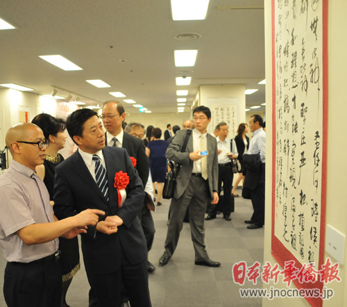 中新网7月11日电 据日本新华侨报网报道,7月9日,由中国国家民族事务委员会、东京中国文化中心共同主办的中国原人大常委会副委员长铁木尔·达瓦买提的“和平与友谊·爱国主义诗歌书画展”在东京隆重举行。中国驻日本大使馆公使韩志强、文化参赞何静以及中日两国书画家、在日华侨华人代表、日本社会各界友人100多人出席了开幕式并参观展览。