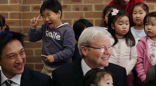 中新网8月7日电 据澳洲新快网消息,陆克文今日访问悉尼莱德联合教堂(Ryde Uniting Church)宣扬工党政府的多元文化政策。这个教堂会定期为当地的韩裔社区举办英语课堂。陆克文迫不及待想宣布工党政府将把韩语列为五大优先语言之一,在澳洲学校教授。但陆克文今天被一名4岁的小男孩抢光了风头。他不甘于充当“舞台道具”,而是完全把自己当成了主角。