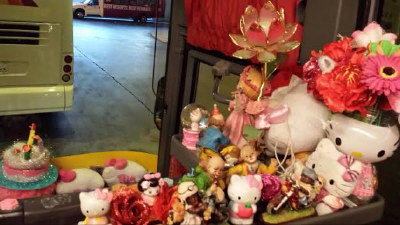 这是一家华人巴士公司的创意,导游小田田表示,她很喜欢Hello Kitty所以希望工作环境也充满着Hello Kitty,六个月前她和巴士公司的同仁花了1000多元买来Hello Kitty贴纸,大家动手改造这辆巴士。不仅车身有Hello Kitty,车内也摆放不少Hello Kitty小东西,让车厢内立刻增添温馨可爱的感觉。