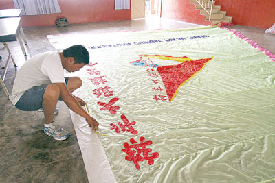 一个飘着细雨的下午,在槟州大旗鼓公会教练王清基指示下,会员们在空地上,以接驳的方式,把一节一节粗细不一的竹竿连接起来,成为大旗的旗杆。