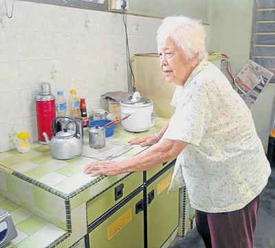 林金枝体力不足,洗菜煮饭时必须用双手按着橱柜和炉灶慢慢移动。(马来西亚《南洋商报》)