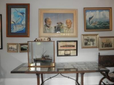 客厅西墙上挂着两幅分别表现桑地亚哥捕获马林鱼,以及正在和鲨鱼搏斗的油画,两幅画中间是一张拼接的照片,照片左边的是海明威,右面是老渔夫的原型富恩特斯,已经相当苍老,当中是停在码头的渔船。下面还有一张较小的富恩特斯的照片,比上面一张更是老得多,这不奇怪,因为他活了104岁。墙边一个玻璃柜里有一个渔船的模型。