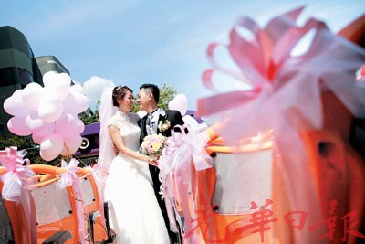 马来西亚华人另类婚车迎亲 双层巴士上定终身(图)