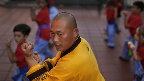 中新网3月22日电 据美国《侨报》引述《洛杉矶时报》19日报道,在洛杉矶华埠,远东大厦(Far East Plaza)的二层,6名学员攥紧拳头,摆出一副“战斗”姿态。中国少林大师释延续在旁发号施令:“猫步!”这些学生立马蹲伏屈膝。