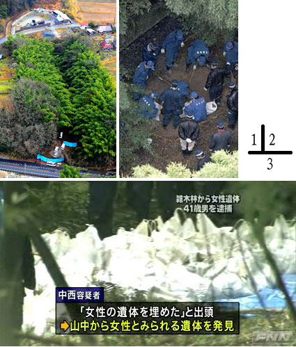 1月22日,日本兵库县警察本部搜查一科根据日本人中西龙司自首时“我曾经埋了一具尸体”的供述,带着他到现场的京都府绫部市的山林进行了搜查,结果发现一具性别不明的尸体。警方初步认定,这具尸体有可能是2008年10月失踪的神户市中央区中文学校兼职教师今泷爱(当时年仅32岁),尸体身份有待经过司法鉴定做最后的确认。今泷爱原为中国人,后来加入了日本国籍。