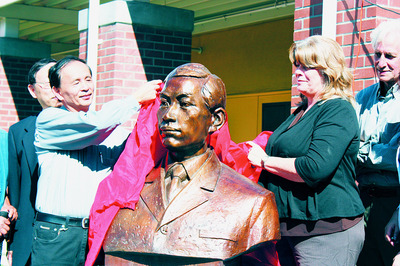中新网9月21日电 据美国《世界日报》报道,1907年在美国屋仑设立飞机制造厂,1909年成功建造并飞行北美洲西岸首架飞机的华裔飞机设计师冯如,是中国和美国航空界的先驱。为庆祝冯如的飞行100周年,上百位民众于19日下午聚集在屋仑雷尼小区大学 (Laney College),为他的纪念铜像揭幕。冯如和莱特兄弟的曾孙辈后代都参加了揭幕仪式。