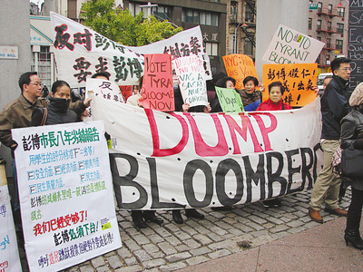 中新网10月18日电 据美国《世界日报》报道,来自纽约市政公民中心联盟、华人职工会、全美餐馆反暴力联盟和华埠小商户联盟等团体的数十名工人和商家代表,16日在曼哈坦华埠且林士果广场集会,反对市长彭博谋求三连任竞选,并呼吁纽约各族裔社区弃选彭博,“夺回我们的城市”。