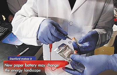 斯坦福大学科研人员前天发表报告,表示墨水黏在纸上,同时亦令单壁碳纳米管与银纳米线薄膜黏在纸上。先前研究发现,用硅纳米线做成的电池是锂离子电池功效的10倍。本次研究结果发表在《美国国家科学院院刊》上。