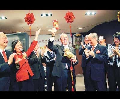 中新网2月25日电 据美国《侨报》报道,纽约市长彭博23日来到华策会人瑞中心,向华裔耆老拜年。人瑞中心主任伍宝玲按华人过年传统给彭博送上仿真金马、金虎和红包,彭博喜笑颜开,开心地摸着虎头,希望给纽约带来好运。