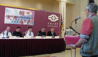 温警局与中侨互助会19日上午一同举办“安居乐业,警民一家”温哥华社区交流会。温警局长朱小荪、华裔资深警官朱镇波、杨子亮、华人警讯服务中心主席黄家碧、与中侨行政总裁陈志动等人均出席活动,吸引不少华裔民众前来参加。朱小荪强调,唯有民众对警方有信心,双方积极合作,才能真正维护社区安全;希望借由类似交流会,让民众抒发意见,加强彼此互动并进行必要改革。