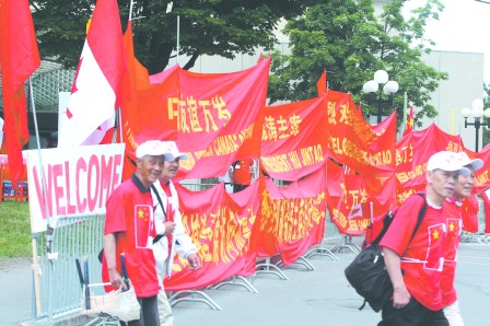 除了渥太华本地的华人团体和学生外,多伦多大学中国学生学者联谊会(UTCSSA),多伦多中国大学生联合会(CUAUT)以及多伦多地区国家公派学生访问学者联谊会等多个大多地区的学生团体也组织了欢迎团,专程赶赴渥太华胡锦涛下榻的酒店举行盛大的欢迎仪式。他们手持自备中国国旗和横幅,在酒店前沿路排成一条秩序井然的欢迎队伍。