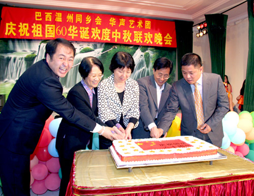 中新网9月21日电 据巴西南美侨报/巴西侨网报道,巴西温州同乡会与华声艺术团庆祝祖国60华诞欢度中秋节联欢晚会19日晚在温州同乡会会馆举行,中国驻圣保罗总领事孙荣茂夫妇以与数百侨胞欢聚一堂,度过一个热烈欢欣的夜晚。
