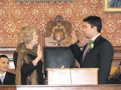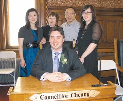 中新网1月6日电 美国麻州剑桥市首位华裔市议员、香港移民之子张礼能(Leland Cheung),4日上午在剑桥市市议会苏利文厅(Sullivan Chamber),与其它八位剑桥市市议员当选人一起宣誓就职。他表示,上任后的工作充满挑战,他将努力实践选前承诺,不辜负选民的厚望。