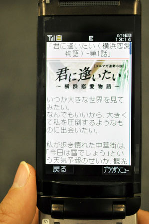 但通过网络和手机浏览方式传播连载小说促进宣传的手段并非横浜中华街发展会协作社首创。去年圣诞期间,海老明市的大型商场“Binauoku”就曾经免费发布过3次由“横浜美少女图鉴”的模特执笔的手机小说《魔术时间》。讲的是一个退休后回到海老名市的女子,在被圣诞欢庆灯火所包围的“Binauoku”偶然遇到自己学生时代的恋人的故事。