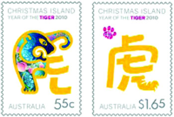 中新网1月13日电 据澳洲《星岛日报》报道,为纪念2010农历新年虎年的来临,澳洲邮局特别推出一套由墨尔本设计师潘德妮设计的别致虎年邮票。