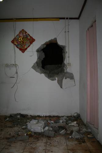 “妻子见状,马上冲回房里把女儿救出,随后护土墙便应声倒下,其中一根洋灰柱更把房间的墙壁击破一个大洞。”