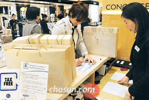 “这个肯定是真货吧?”韩国首尔新世界百货商店总店的外国人“退税(tax refund)”柜台前挤满了中国人。一位顾客拿着一块闪闪发光的名牌手表给百货商店的汉语翻译看并询问。