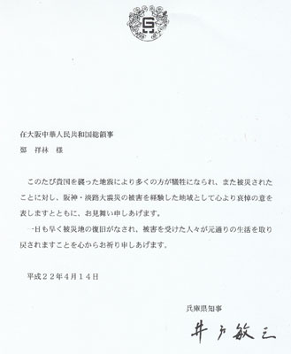 兵库县知事井户敏三在慰问电中说:“获悉贵国发生了不幸的地震导致很多人民牺牲,作为有经历过阪神淡路大震灾的地区兵库县,我们对受灾者表示由衷的哀悼和深刻的慰问。我们祈祷灾区早日恢复正常,从心里祝愿地震受害者早日康复。”