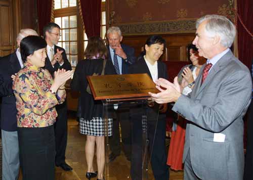 为了表现该城对建立孔子学院的重视,挂牌仪式特别移到拉罗舍尔德市政府大厅举行。市政厅也是一处历史古迹,火焰哥特式围墙包围着文艺复兴风格的建筑主体。特别显眼的是市政府特意在大门口的欧盟旗和法国国旗旁边挂上了鲜艳的五星红旗。为了让仪式隆重热烈,除了普瓦图-夏朗德大区议会与拉罗舍尔市地一干政要及嘉宾外,市长马科斯穆•布诺特别邀请了社会各界人士以及当地的华侨华人和留学生等约200人出席当天的活动,把个节日大厅挤得满满的。