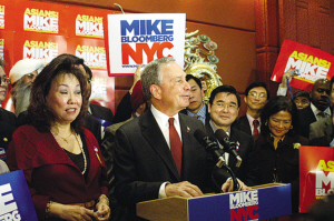13日的造势活动主要由皇后区共和党人士组织。皇后区共和党领袖谢美琳,法拉盛华人(工商)促进会理事长顾雅明等人站在主席台上。现场还有中文媒体、韩裔和印度裔等团体的代表宣布支持彭博连任第三届市长,称其可以带领纽约渡过经济危机。现场亚裔民众近百人,高呼支持彭博的口号,场面一度十分拥挤。
