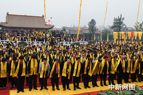 中新网鹿邑10月18日电(记者 周小云)天下李姓,根在鹿邑。18日,祖地寻根 共建和谐——世界李氏宗亲大会暨拜祖大典在河南省鹿邑县明道宫隆重举行,来自海内外1千余名李氏宗亲代表、嘉宾,以及河南相关官员出席了大会开幕式,在此共拜始祖以示对先祖的无限崇敬和缅怀之情。