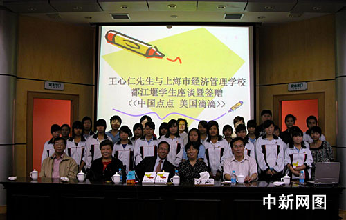 今天的赠书仪式上,王心仁先生与大家分享了他的人生经验。当了解到去年汶川大地震后上海市经济管理学校接收了近70名来自上海对口支援地区四川都江堰的学生时,王心仁先生勉励这些远离家乡的同学能够珍惜学习机会,并向这些学生每人送上了一张上海交通卡,希望他们多多了解这个城市。