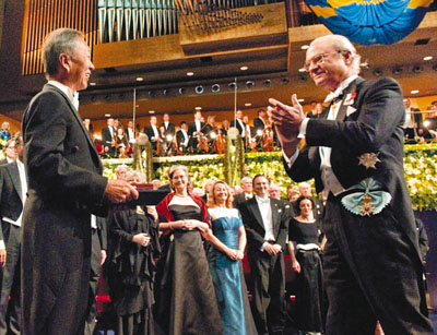 中新网12月11日电 2009年诺贝尔奖颁奖礼昨在瑞典斯德哥尔摩演奏厅举行,一生获奖无数的光纤之父、前香港中文大学校长高锟,正式从瑞典国王古斯塔夫.卡尔16世(Carl XVI Gustaf)手中接过诺贝尔物理学奖。期间大会更为他作出特别安排,由国王走到其座位旁边颁奖,盛装出席的他,以灿烂的笑容迎接气氛庄严但欢乐的历史性一刻。