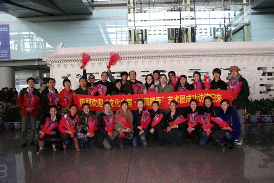 中新社北京3月9日电 (南若然)9日中午,“文化中国·四海同春”赴欧洲艺术团结束了在法国、英国、比利时和意大利的慰侨演出后,返回北京。