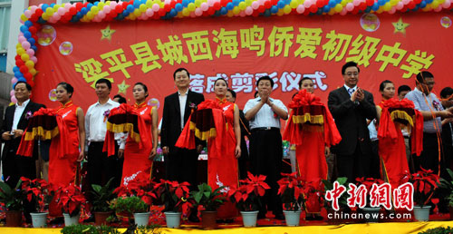 中新网梁平6月21日电 (记者 郭晋嘉)21日,重庆市梁平县城西海鸣侨爱中学(原梁平城西中学)竣工落成,国侨办副主任马儒沛、侨爱中学捐资人屠海鸣等出席落成剪彩仪式。