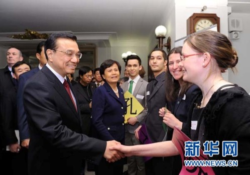 1月11日,正在英国进行正式访问的中国国务院副总理李克强在伦敦大英博物馆同孔子学院的英国学生亲切交流。这是李克强欣赏学生们用汉语表演的节目。(新华社记者 饶爱民 摄)