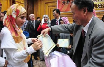 中新网1月12日电 据国家汉办网站消息,1月6日,埃及开罗大学孔子学院成立3周年庆典暨第6届培训班结业典礼,在开罗大学会议中心成功举行。中国大使馆教育专员霍文杰等出席典礼。