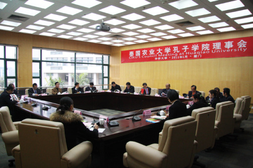 泰国农业大学孔子学院理事会于1月11日下午在华侨大学厦门校区王源兴国际会议中心召开,中泰双方理事会成员一同总结孔子学院办学经验,共谋孔子学院未来发展,在孔子学院丰富内涵、扩大影响、提升层次、办出特色等多方面达成高度共识。