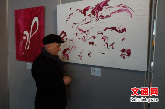 一进柏林中国文化中心的大厅,曼弗雷德·葛伦德先生就饶有兴趣地欣赏起正在一楼展厅展出的女艺术家赵莉的现代抽象油画作品,其中一幅名为《辉·煌》的作品使用的黑、红、金三色,使他一下子联想到了德国国旗的颜色。他对赵莉的画作赞赏有加,表示自己事先已经从网上了解了赵莉的绘画作品。随后,陈建阳主任向曼弗雷德·葛伦德先生赠送了赵莉展览的纪念画册《品颐Ш》。